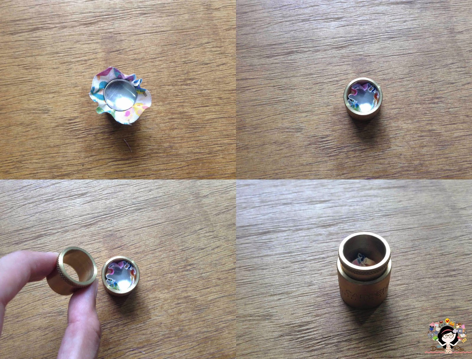 Encaixe a parte 2 dentro da parte 1 da matriz. Pegue o círculo de tecido e a base do botão bombê e centralize sobre a matriz.
