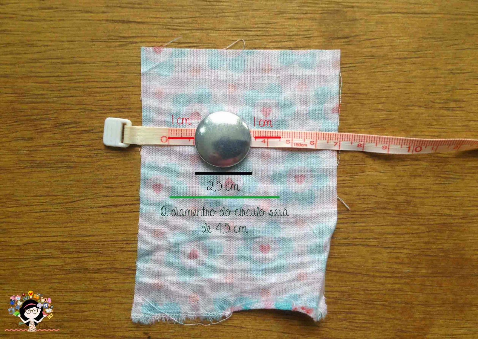 Você precisa cortar círculos nos tecidos. Para isso, meça a base do seu botão e some mais 2 cm. Esse resultado, vai ser o diâmetro do seu círculo.