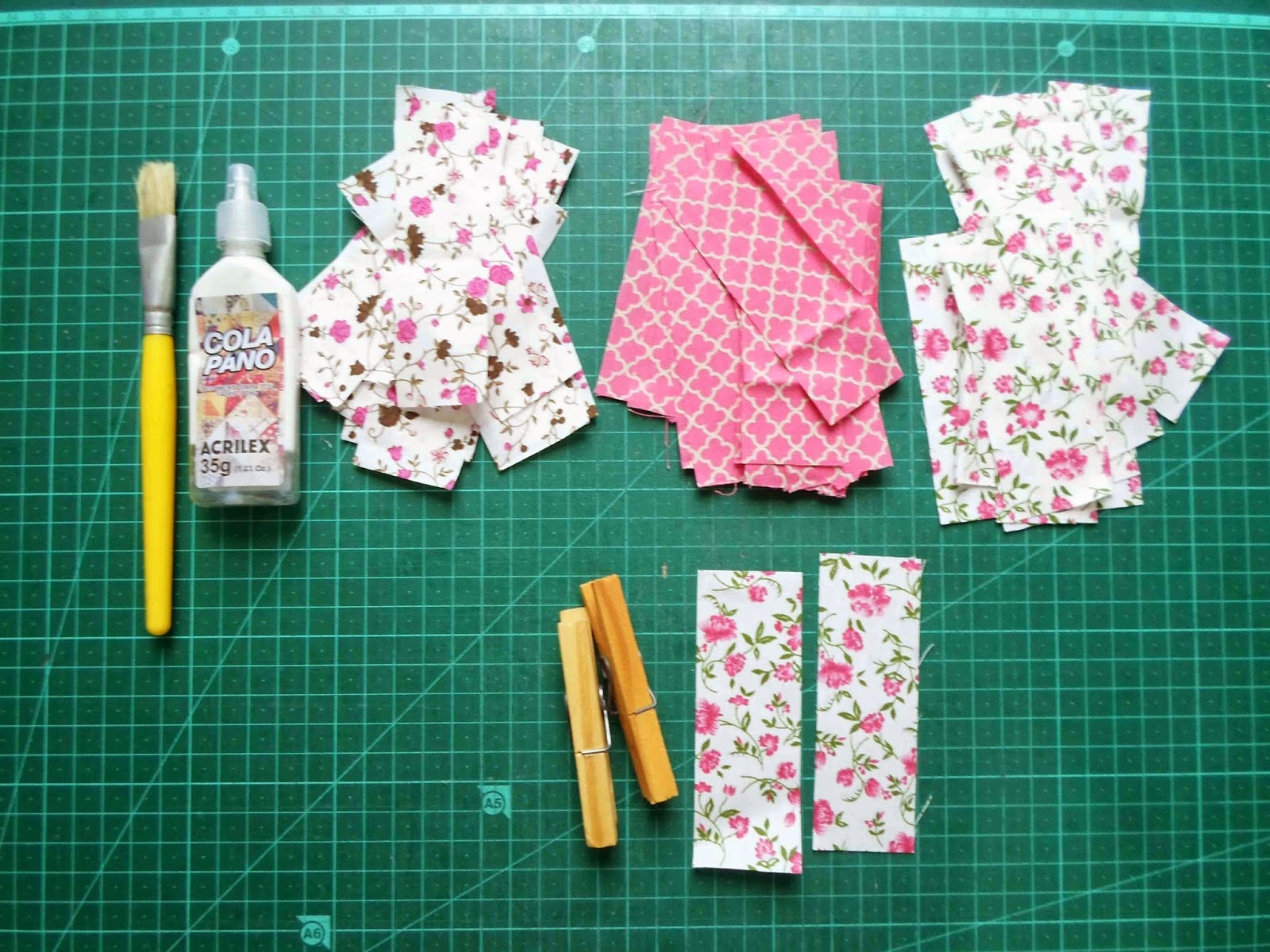 1 – Para forrar cada pregador você precisará de dois pedaços de tecido de 3,5 x 10 cm cada. (Se você quiser evitar que seu tecido desfie muito, antes de cortar os pedaços, aplique termolina leitosa pelo avesso do tecido e espere secar)